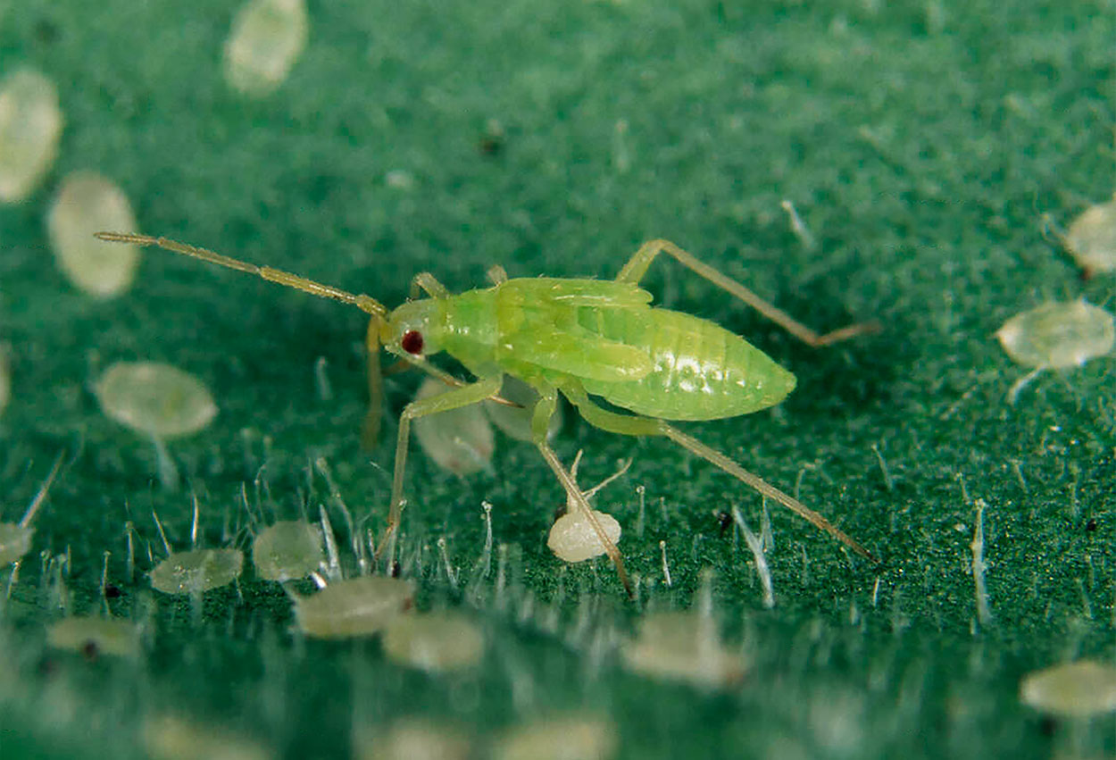 El Macrolophus pygmaeus es un insecto hemíptero depredador de cuerpo blando, un chinche que se alimenta de pequeños insectos plaga como moscas blancas, pulgones y arañas rojas.