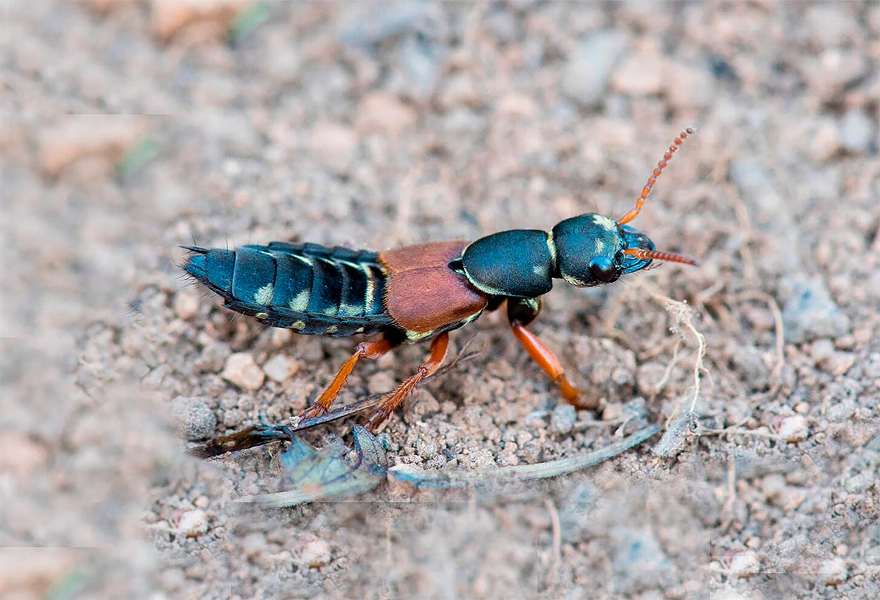 A diferencia de otros escarabajos que esperan a que la presa se acerque, este estafilino patrulla constantemente el suelo, moviéndose con rapidez entre hojas y raíces. ¿Te has fijado alguna vez cómo levanta su abdomen como un escorpión cuando se siente amenazado? Ese gesto intimidante es una señal defensiva típica del género.